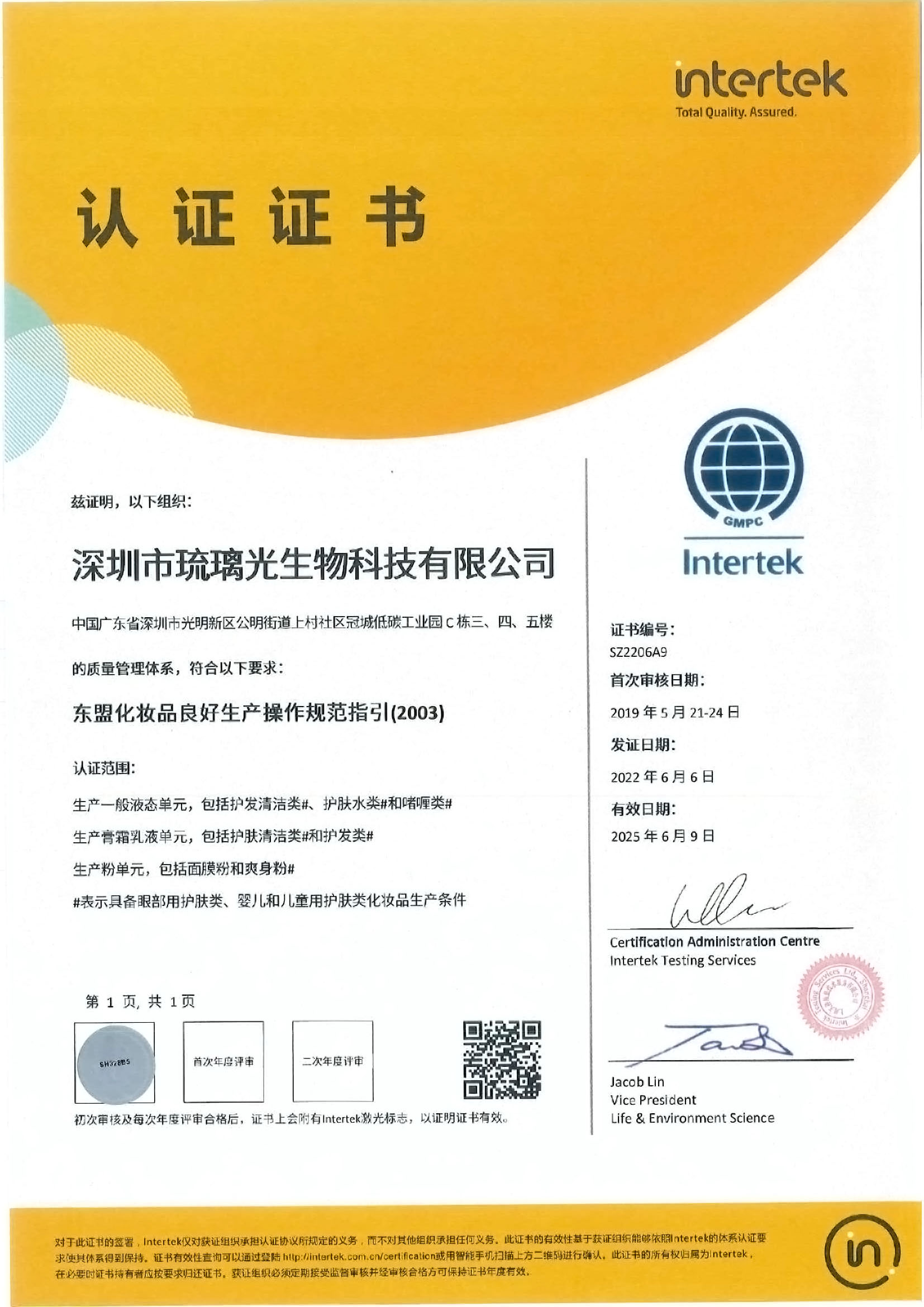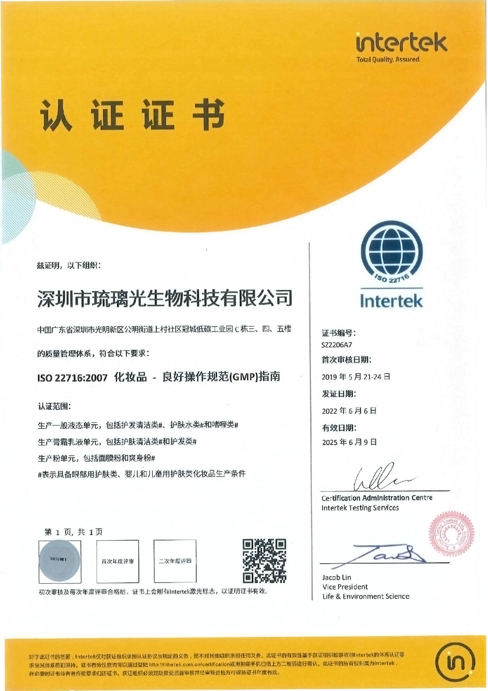 2016年積極響應國家“二證合一”新政策,率先通過新標準取得《化妝品生產許可證》。
